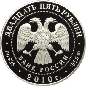 Аверс: вверху вдоль канта номинал «ДВАДЦАТЬ ПЯТЬ РУБЛЕЙ», внизу слева химическое название «Ag» и проба «925» металла, внизу по центру год выпуска «2010 г.», внизу справа чистый вес находящегося в монете драгоценного металла «155,50» и монограмма монетного двора «ММД». В середине в ободке из точек двуглавый орел под ним с внутренней стороны точечного ободка слова «БАНК РОССИИ».