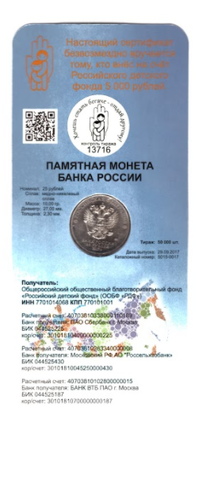 На лицевой стороне монеты расположено рельефное изображение Государственного герба Российской Федерации, над ним вдоль канта — надпись полукругом: «РОССИЙСКАЯ ФЕДЕРАЦИЯ», обрамленная с обеих сторон сдвоенными ромбами, справа — товарный знак монетного двора, внизу под гербом в центре в три строки — надпись «БАНК РОССИИ», номинал монеты: «25 РУБЛЕЙ», год: «2017 г.»