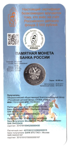 На лицевой стороне монеты расположено рельефное изображение Государственного герба Российской Федерации, над ним вдоль канта — надпись полукругом: «РОССИЙСКАЯ ФЕДЕРАЦИЯ», обрамленная с обеих сторон сдвоенными ромбами, справа — товарный знак монетного двора, внизу под гербом в центре в три строки — надпись «БАНК РОССИИ», номинал монеты: «25 РУБЛЕЙ», год: «2017 г.»