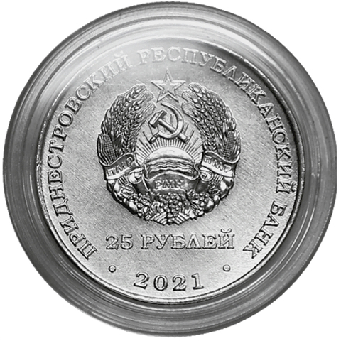 Аверс монеты: в центре – изображение Государственного герба Приднестровской Молдавской Республики; по кругу – надписи: вверху – «ПРИДНЕСТРОВСКИЙ РЕСПУБЛИКАНСКИЙ БАНК», внизу – «25 РУБЛЕЙ»; в нижней части под гербом – «2021».