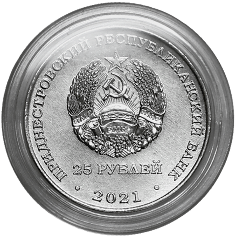 Аверс монет: в центре – изображение Государственного герба Приднестровской Молдавской Республики; по кругу – надписи: вверху– «ПРИДНЕСТРОВСКИЙ РЕСПУБЛИКАНСКИЙ БАНК», внизу – «25 РУБЛЕЙ»; в нижней части под гербом – «2021».