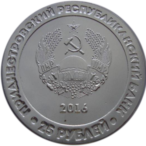 Аверс: в центре – изображение Государственного герба Приднестровской Молдавской Республики; по кругу – надписи: вверху – «ПРИДНЕСТРОВСКИЙ РЕСПУБЛИКАНСКИЙ БАНК», внизу – номинал «25 РУБЛЕЙ»; в нижней части под гербом – год выпуска монеты «2016».