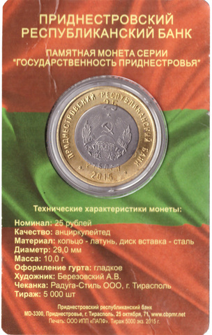 25 рублей. 25 лет образования ПМР. Приднестровье. 2015 г. В буклете
