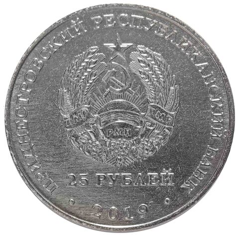 Аверс монеты: в центре – изображение Государственного герба Приднестровской Молдавской Республики; по кругу – надписи: вверху – «ПРИДНЕСТРОВСКИЙ РЕСПУБЛИКАНСКИЙ БАНК», внизу – «25 РУБЛЕЙ»; в нижней части под гербом – «2019».
