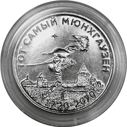 Реверс: в центре – стилизованное изображение барона Мюнхгаузена, летящего верхом на ядре на фоне крепостных стен, над ним – надпись «ТОТ САМЫЙ МЮНХГАУЗЕН», внизу – надпись «1720-2020».