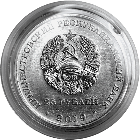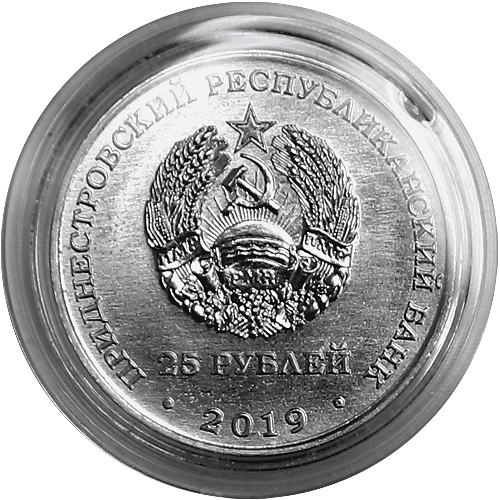 Аверс: в центре – изображение Государственного герба Приднестровской Молдавской Республики; по кругу – надписи: вверху – «ПРИДНЕСТРОВСКИЙ РЕСПУБЛИКАНСКИЙ БАНК», внизу – «25 РУБЛЕЙ»; в нижней части под гербом – «2019».