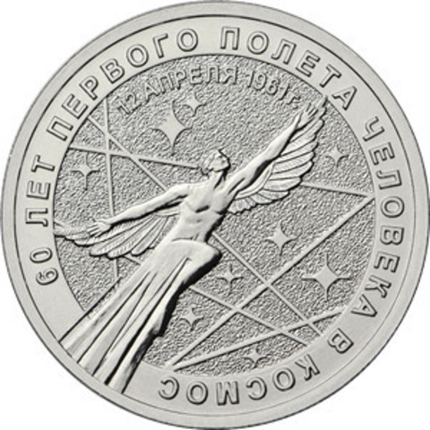 Реверс: рельефное изображение летящей фигуры человека с крыльями на фоне стилизованного изображения звездного неба; имеются надписи, вверху по внутренней окружности: «12 АПРЕЛЯ 1961 г.», на кольце: «60 ЛЕТ ПЕРВОГО ПОЛЕТА ЧЕЛОВЕКА В КОСМОС».