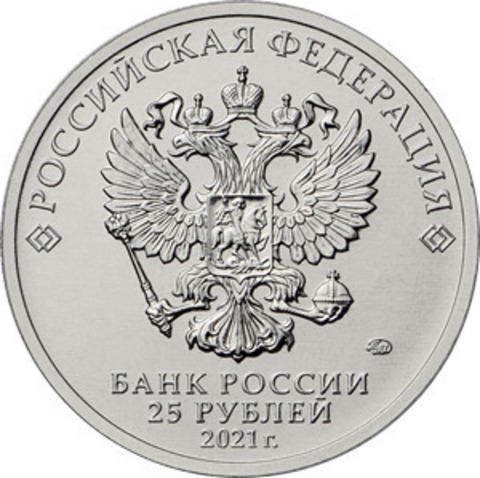 Аверс: Рельефное изображение Государственного герба Российской Федерации, над ним вдоль канта – надпись полукругом: "РОССИЙСКАЯ ФЕДЕРАЦИЯ", обрамленная с обеих сторон сдвоенными ромбами, под гербом в центре в три строки – надпись: "БАНК РОССИИ", номинал монеты: "25 РУБЛЕЙ", год выпуска: "2021 г.", справа – товарный знак монетного двора.