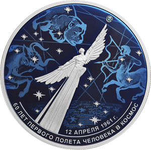 На оборотной стороне расположены рельефные изображения летящей фигуры человека с крыльями и звезды в виде вставки из искусственного камня на фоне выполненных в цвете стилизованных изображений звездного неба и мифологических животных – зодиакальных созвездий Тельца, Льва, Стрельца; внизу по окружности имеются надписи: «12 АПРЕЛЯ 1961 г.», «60 ЛЕТ ПЕРВОГО ПОЛЕТА ЧЕЛОВЕКА В КОСМОС».