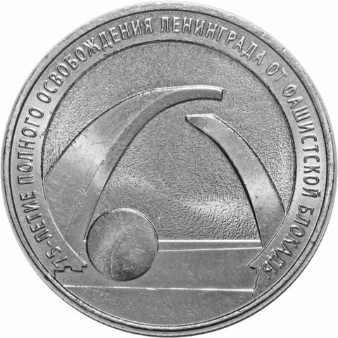 Реверс: изображен известный на весь мир мемориал «Разорванное кольцо», который состоит из двух не сомкнутых дуг. По окружности монеты 25 рублей Освобождение Ленинграда имеется надпись: «75-ЛЕТИЕ ПОЛНОГО ОСВОБОЖДЕНИЯ ЛЕНИНГРАДА ОТ ФАШИСТСКОЙ БЛОКАДЫ».