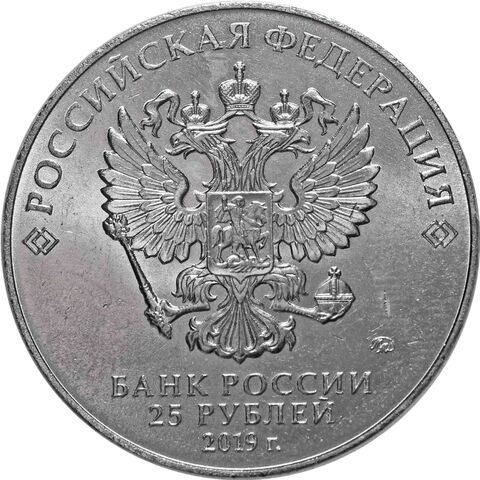 Аверс: рельефное изображение Государственного герба Российской Федерации, над ним вдоль канта – надпись полукругом: "РОССИЙСКАЯ ФЕДЕРАЦИЯ", обрамленная с обеих сторон сдвоенными ромбами, под гербом в центре в три строки – надпись: "БАНК РОССИИ", номинал монеты: "25 РУБЛЕЙ", год выпуска: "2018 г.", справа – товарный знак монетного двора.