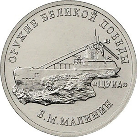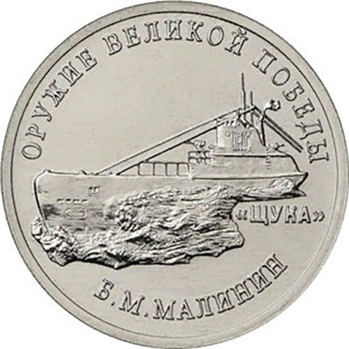 Реверс: На оборотной стороне монеты «Конструктор оружия Б.М. Малинин» (каталожный № 5015-0036) расположено рельефное изображение подводной лодки типа «Щука», справа — надпись «ЩУКА»; по окружности имеются надписи: вверху — «ОРУЖИЕ ВЕЛИКОЙ ПОБЕДЫ», внизу — «Б.М. МАЛИНИН»