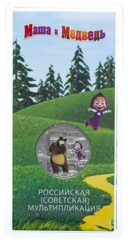 На оборотной стороне монеты «Маша и Медведь» с цветным покрытием расположено выполненное в цвете изображение героев мультфильма «Маша и Медведь» на фоне рельефного изображения интерьера дома Медведя; вверху имеется надпись: «Маша и Медведь».