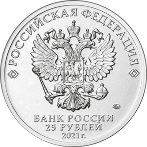 На лицевой стороне монет расположено рельефное изображение Государственного герба Российской Федерации, над ним вдоль канта — надпись полукругом: «РОССИЙСКАЯ ФЕДЕРАЦИЯ», обрамленная с обеих сторон сдвоенными ромбами, справа — товарный знак Московского монетного двора, внизу под гербом в центре в три строки — надпись: «БАНК РОССИИ», номинал монет: «25 РУБЛЕЙ», дата: «2021 г.».