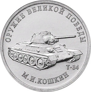 Реверс: На обротной стороне монеты «Конструктор оружия М.И. Кошкин» (каталожный № 5015-0035) расположено рельефное изображение среднего танка Т-34, под ним справа — надпись «Т-34»; по окружности имеются надписи: вверху — «ОРУЖИЕ ВЕЛИКОЙ ПОБЕДЫ», внизу — «М.И. КОШКИН»