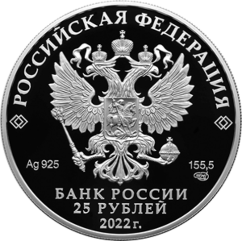 На лицевой стороне монеты расположено рельефное изображение Государственного герба Российской Федерации, имеются надписи: «РОССИЙСКАЯ ФЕДЕРАЦИЯ», «БАНК РОССИИ», номинал монеты: «25 РУБЛЕЙ», дата: «2022 г.», обозначение металла по Периодической системе элементов Д.И. Менделеева, проба сплава, товарный знак Санкт-Петербургского монетного двора и масса драгоценного металла в чистоте.