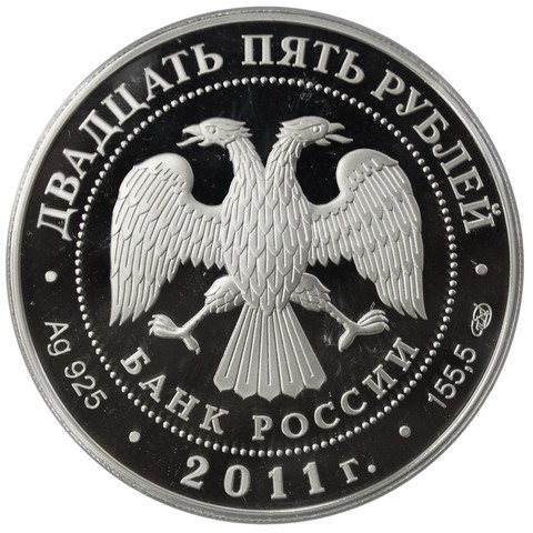 Аверс: вверху вдоль канта номинал «ДВАДЦАТЬ ПЯТЬ РУБЛЕЙ», внизу слева химическое название «Ag» и проба «925» металла, внизу по центру год выпуска «2011 г.», внизу справа чистый вес находящегося в монете драгоценного металла «155,50» и монограмма монетного двора «СПМД». В середине в ободке из точек двуглавый орел под ним с внутренней стороны точечного ободка слова «БАНК РОССИИ».