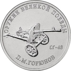 Реверс:«Конструктор оружия П.М. Горюнов» (каталожный № 5015-0042)расположено рельефное изображение станкового пулемета СГ-43, справа — надпись: «СГ-43»; по окружности имеются надписи, вверху: «ОРУЖИЕ ВЕЛИКОЙ ПОБЕДЫ», внизу: «П.М. ГОРЮНОВ»