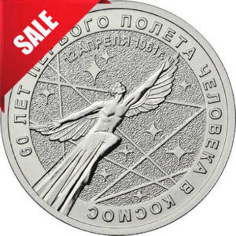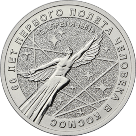 Реверс: рельефное изображение летящей фигуры человека с крыльями на фоне стилизованного изображения звездного неба; имеются надписи, вверху по внутренней окружности: «12 АПРЕЛЯ 1961 г.», на кольце: «60 ЛЕТ ПЕРВОГО ПОЛЕТА ЧЕЛОВЕКА В КОСМОС».