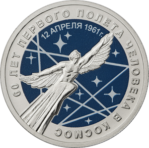 Реверс: рельефное изображение летящей фигуры человека с крыльями на фоне выполненного в цвете стилизованного изображения звездного неба; имеются надписи, вверху по внутренней окружности: «12 АПРЕЛЯ 1961 г.», на кольце: «60 ЛЕТ ПЕРВОГО ПОЛЕТА ЧЕЛОВЕКА В КОСМОС».