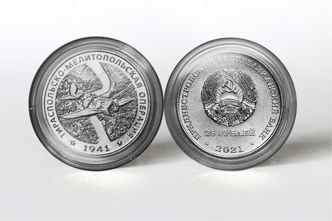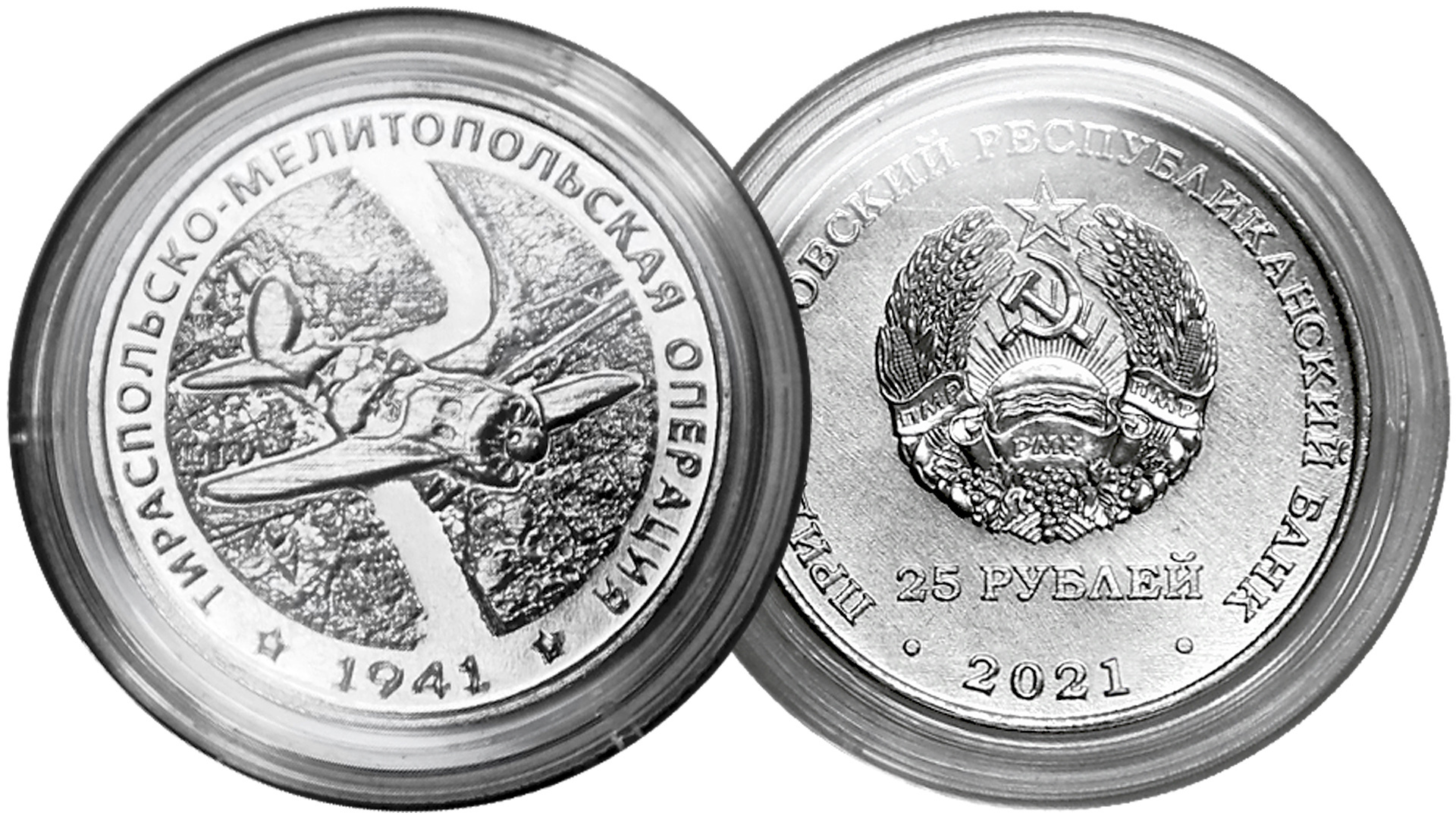На реверсе монеты в центре изображён летящий самолет, под ним графическое изображение полей и реки, вверху по кругу надпись «ТИРАСПОЛЬСКО-МЕЛИТОПОЛЬСКАЯ ОПЕРАЦИЯ», внизу – надпись «1941» в обрамлении пятиконечных звёзд.