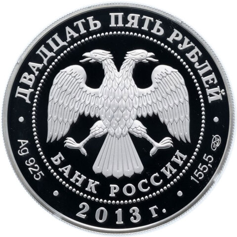 Аверс: в центре - эмблема Банка России (двуглавый орёл с опущенными крыльями, под ним - надпись полукругом "БАНК РОССИИ"), обрамленная кругом из точек и надписями по кругу - вверху: "ДВАДЦАТЬ ПЯТЬ РУБЛЕЙ", внизу: слева - обозначения драгоценного металла и пробы сплава, в центре - дата выпуска "2013 г.", справа - содержание химически чистого металла и товарный знак монетного двора.