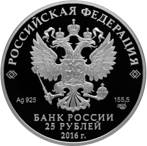 Аверс: на зеркальном поле диска — рельефное изображение Государственного герба Российской Федерации, над ним вдоль канта — надпись полукругом: «РОССИЙСКАЯ ФЕДЕРАЦИЯ», обрамленная с обеих сторон сдвоенными ромбами, внизу под гербом: слева — обозначения драгоценного металла и пробы сплава, справа — содержание химически чистого металла и товарный знак монетного двора, внизу в центре в три строки — надпись: «БАНК РОССИИ», номинал монеты: «25 РУБЛЕЙ», год выпуска: «2016 г.».