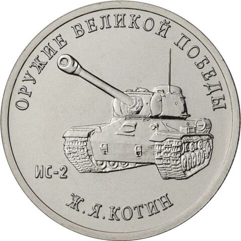 Реверс: На оборотной стороне монеты «Конструктор оружия Ж.Я. Котин» (каталожный № 5015-0034) расположено рельефное изображение тяжелого танка ИС-2, слева — надпись «ИС-2»; по окружности имеются надписи: вверху — «ОРУЖИЕ ВЕЛИКОЙ ПОБЕДЫ», внизу — «Ж.Я. КОТИН»