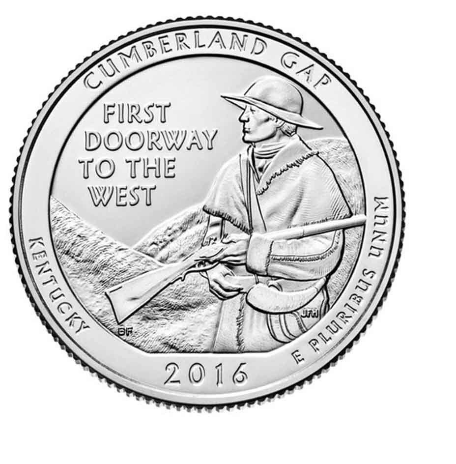 На реверсе: изображение человека с ружьём в руках на фоне гор, который смотрит влево (на запад). Слева от изображения надпись: "FIRST DOORWAY TO THE WEST" (первый путь на запад). В нижней части монеты расположена надпись: "KENTUKY / 2016 / E PLURIBUS UNIUM" (Кентуки / 2016 / в целом - едины). В верхней части монеты расположена надпись: "CUMBERLAND GAP" (Камберлэнд Гап).