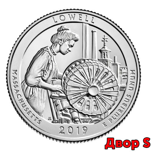 Реверс: В центре изображена девушка, работающая на мощном ткацком станке с выдающейся круговой катушкой, в окне виден Лоуэлл, в т.ч. башня с Boott Mill. По левому краю монеты расположена надпись: "MASSACHUSETTS" (штат Массачусетс), по правому - "E PLURIBUS UNUM". Вверху полукругом отчеканено название национального парка: "LOWELL" (парк Лоуэлл). В нижней части монеты указан год чеканки: "2019".