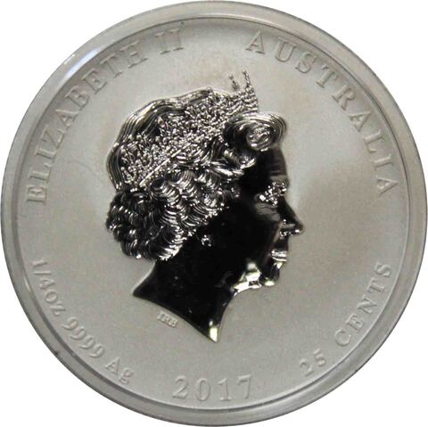 Аверс: В центре – рельефное изображение портрета Ее Величества Елизаветы II. По окружности надписи: ELIZABETH II (Елизавета II), AUSTRALIA (Австралия), номинал 25 CENTS (25 центов), год выпуска 2017, 1/4 oz (1/4 унции) и характеристика металла 999 SILVER (серебро 999 пробы).