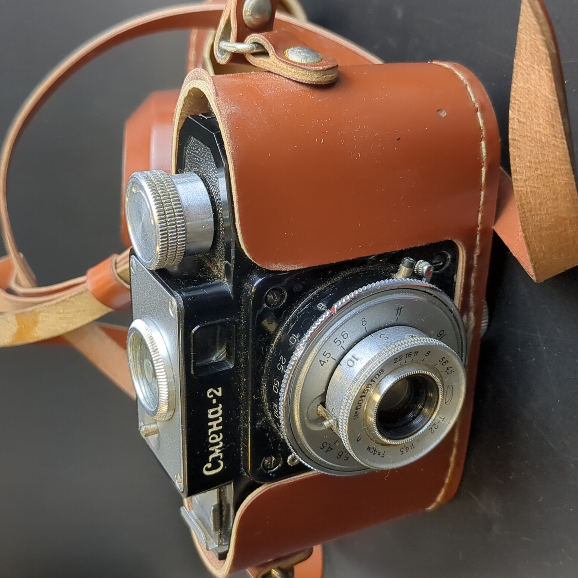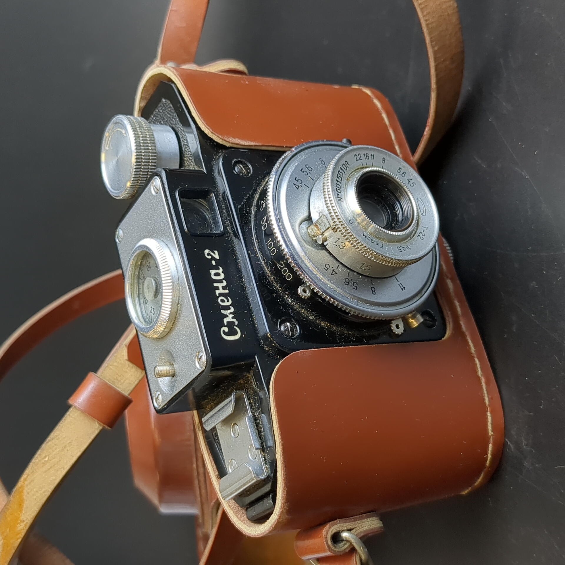 №26 Фотоаппарат "Смена-2" в оригинальном кофре , пластик, стекло, металл, кожа, Государственный оптико-механический завод имени ОГПУ (ГОМЗ), СССР, 1958-1961 гг.