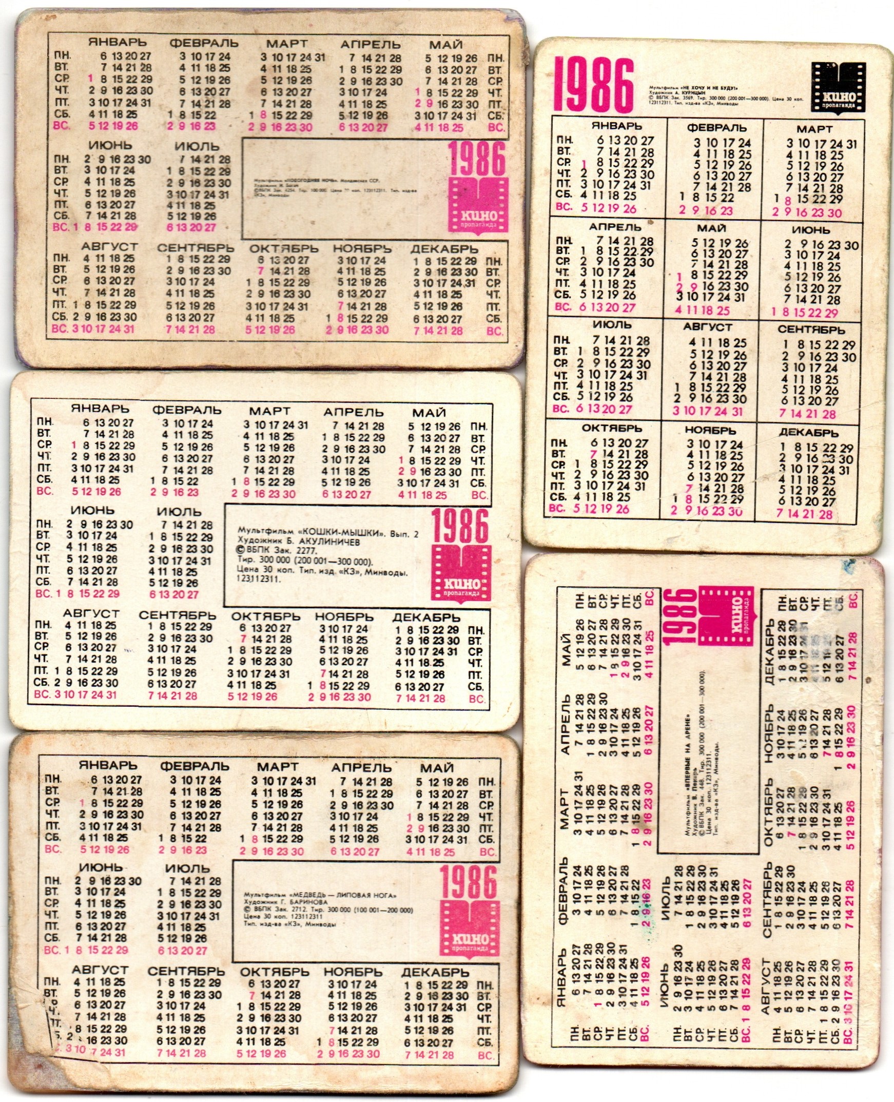 № 26 Набор из 5 стерео Календариков. Мультфильмы СССР 1986 г. Календарик Стерео мультфильмы : Новогодняя ночь Молдавская ССР/ Не хочу и не буду! / Кошки-мышки / Медведь - липовая нога / Впервые на арене. Карманный календарик переливной объемный 3D. СССР. Художники СССР. Состояние на фото
