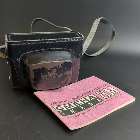 №27 Фотоаппарат "Смена 8М" в родном футляре с рукводством по эксплуатации, бакелит, Ленинградское оптико-механическое объединение, г. Ленинград, СССР, 1970-1990 гг. Рабочий. Состояние на фото