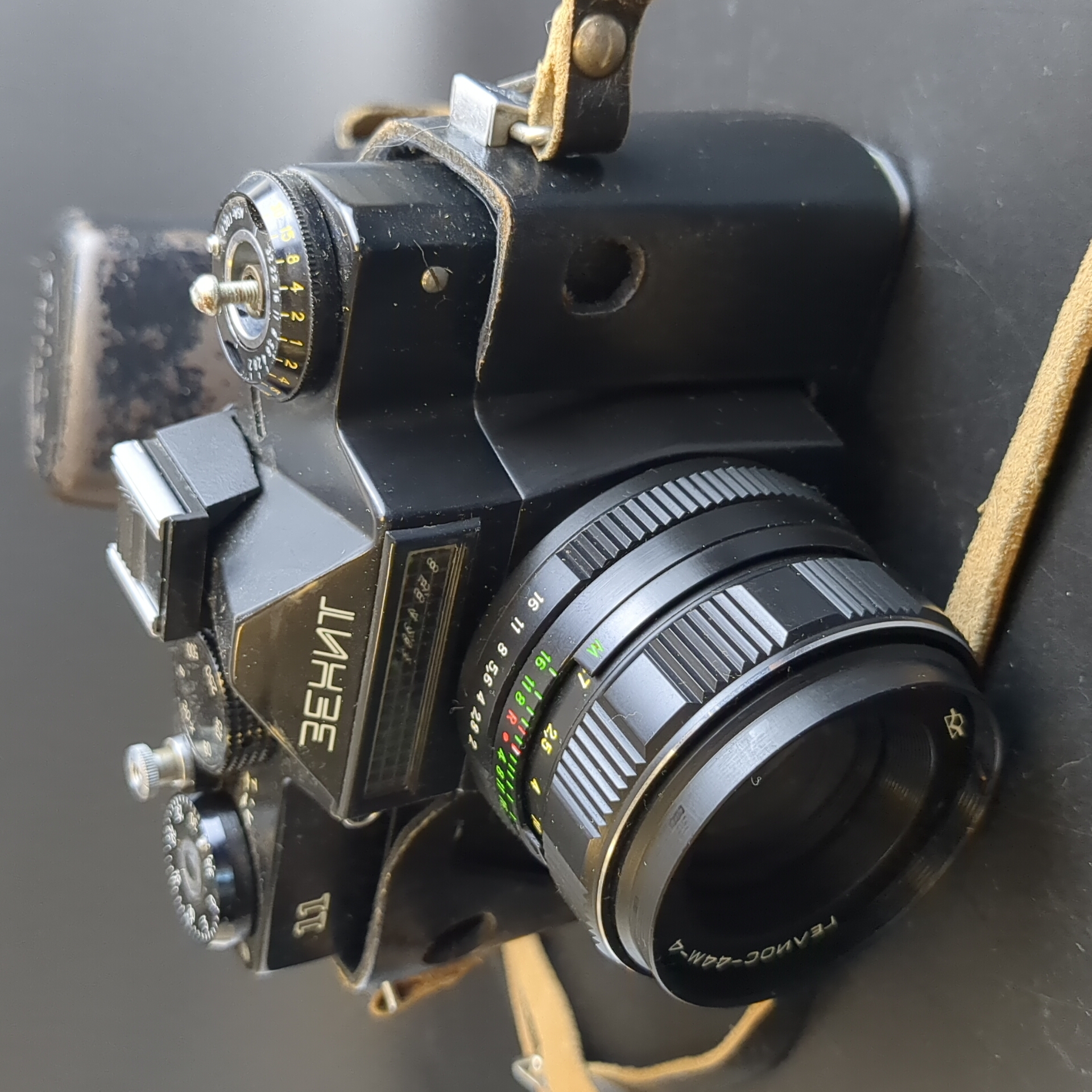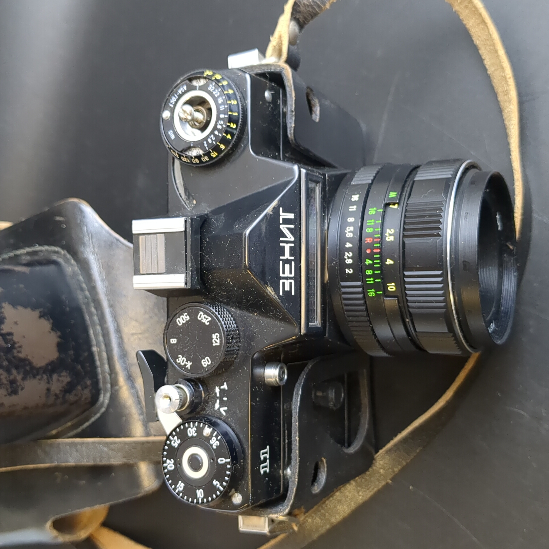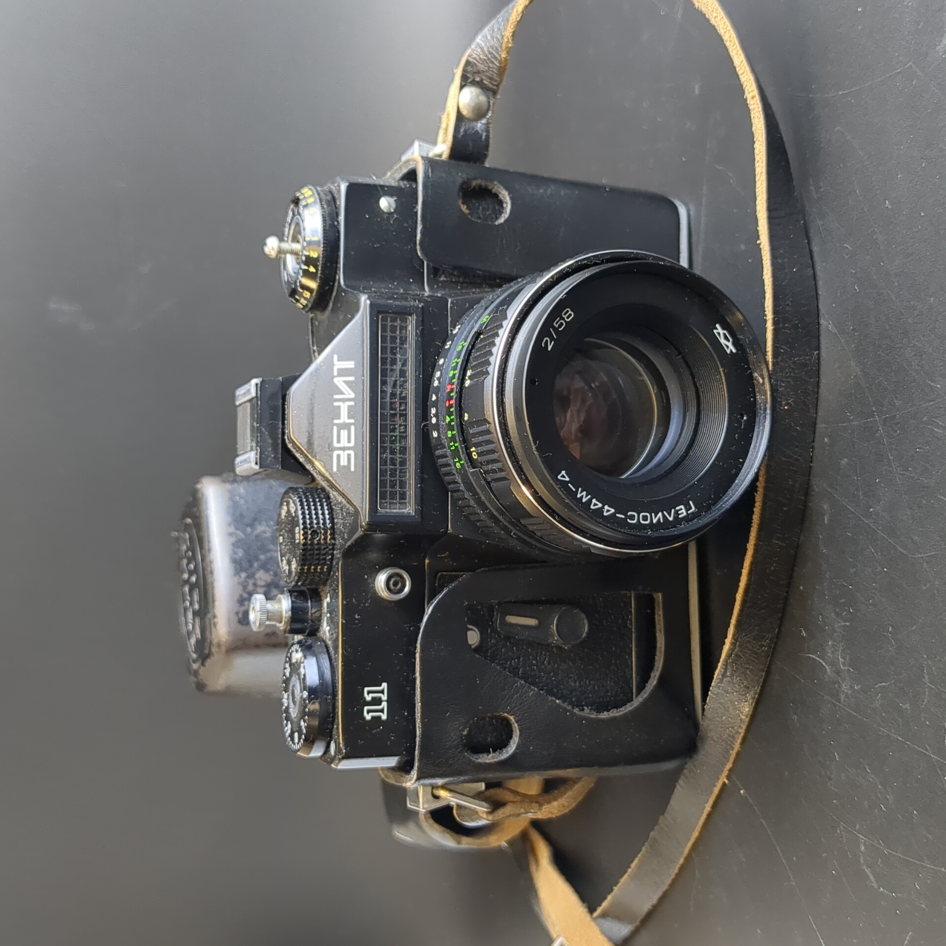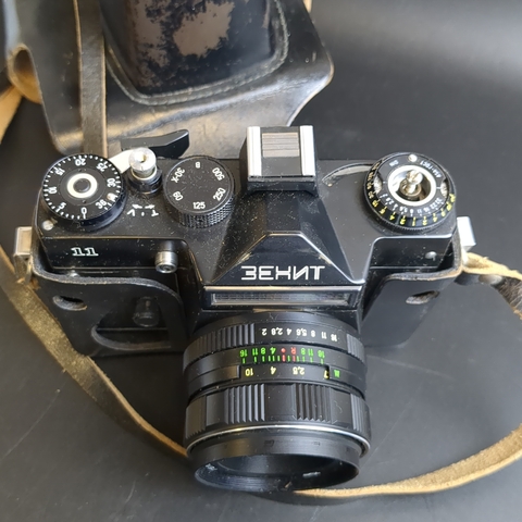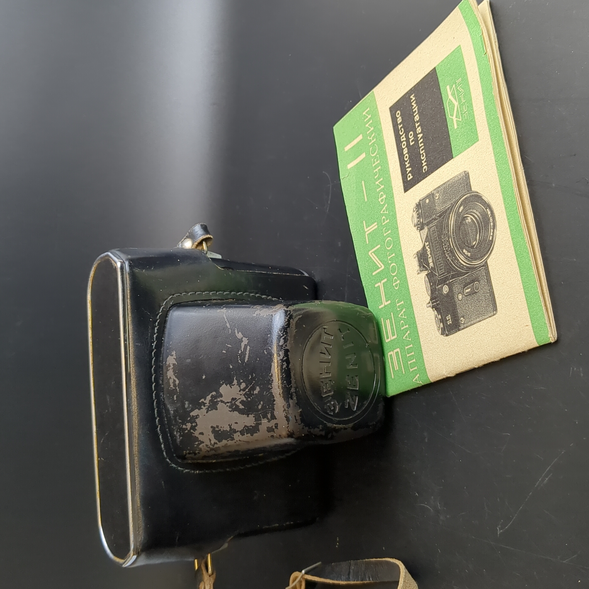 №28 Фотоаппарат Зенит-11 с объективом Helios - 44М -4, в родном кофре с руководством по эксплуатации, алюминиевый сплав, Красногорский механический завод, СССР, 1981-1992 гг. Рабочий. Состояние на фото