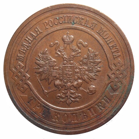Аверс: вверху вдоль края монеты в выделенной выступающей рамкой полосе надпись «МЕДНАЯ РОССИЙСКАЯ МОНЕТА», внизу вдоль края монеты в выступающей рамке, соединённой с верхней рамкой расположенными слева и справа фигурными решетками, на выступающей плашке вдавленными буквами обозначение номинала монеты «ТРИ КОПЕЙКИ», в середине Малый Государственный Герб Российской империи.