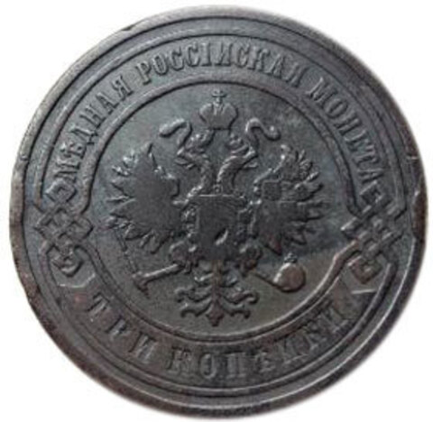 Аверс: вверху вдоль края монеты в выделенной выступающей рамкой полосе надпись «МЕДНАЯ РОССИЙСКАЯ МОНЕТА», внизу вдоль края монеты в выступающей рамке, соединённой с верхней рамкой расположенными слева и справа фигурными решетками, на выступающей плашке вдавленными буквами обозначение номинала монеты «ТРИ КОПЕЙКИ», в середине Малый Государственный Герб Российской империи.