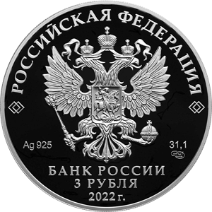 На лицевой стороне монеты расположено рельефное изображение Государственного герба Российской Федерации, имеются надписи: «РОССИЙСКАЯ ФЕДЕРАЦИЯ», «БАНК РОССИИ», номинал монеты: «3 РУБЛЯ», дата: «2022 г.», обозначение металла по Периодической системе элементов Д.И. Менделеева, проба сплава, товарный знак Санкт-Петербургского монетного двора и масса драгоценного металла в чистоте.