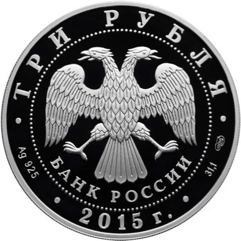 Аверс: вверху вдоль канта номинал «ТРИ РУБЛЯ», внизу слева химическое название «Ag» и проба «925» металла, внизу по центру год выпуска «2015 г.», внизу справа чистый вес находящегося в монете драгоценного металла «31,10» и монограмма монетного двора «СПМД». В середине в ободке из точек двуглавый орел под ним с внутренней стороны точечного ободка слова «БАНК РОССИИ».
