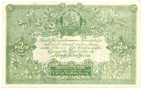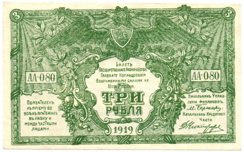 3 рубля 1919 год - Юг России - Серия АА-080 - Пресс