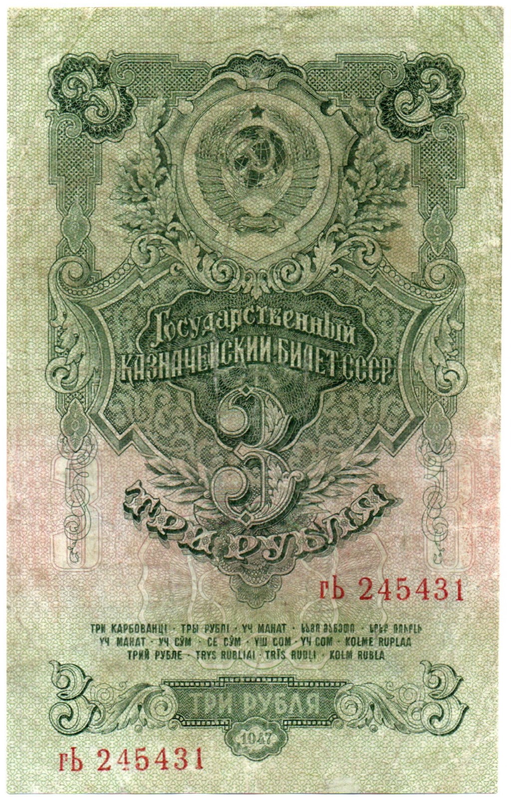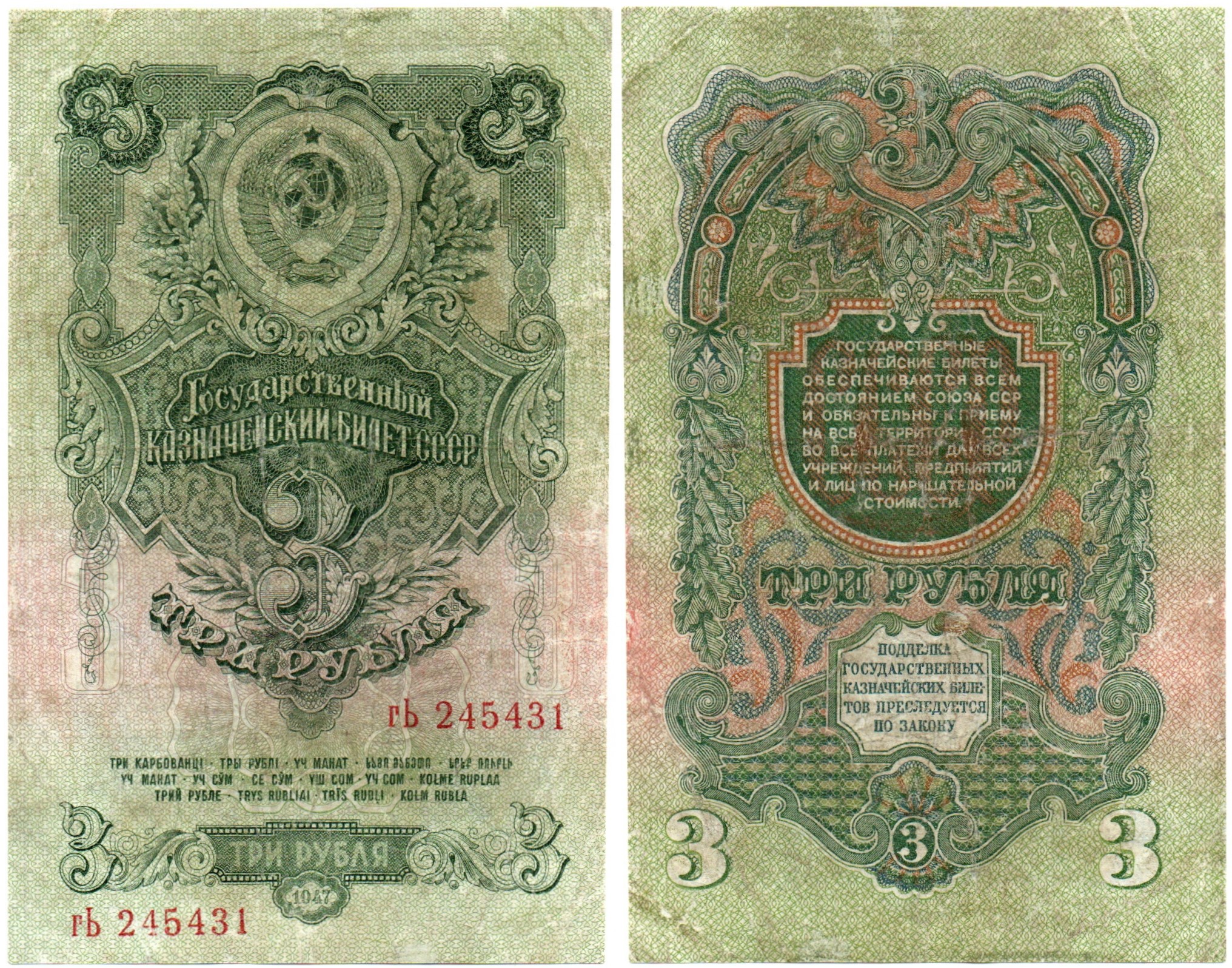 3 рубля 1947 год Казначейский билет СССР. гЬ 245431