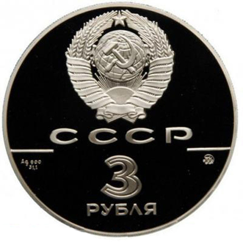 Сверху герб СССР с 15 витками ленты, под ним буквы «СССР», ниже слева и справа черта, под чертой слева химическое обозначение «Ag» и проба «900» металла из которого сделана монета, под ними чистый вес драгоценного металла «31,1», под чертой справа монограмма монетного двора «ММД», ниже обозначение достоинства монеты цифра «3» и ниже слово «РУБЛЯ», внизу у канта год выпуска монеты «1988».