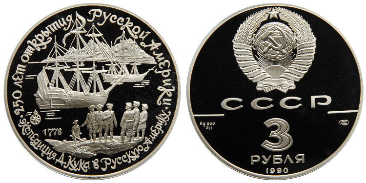сверху вдоль канта монеты слова «250 ЛЕТ ОТКРЫТИЯ РУССКОЙ АМЕРИКИ», внизу «ЭКСПЕДИЦИЯ Д. КУКА В РУССКУЮ АМЕРИКУ», в середине сверху корабли «Resolution» и «Discovery», ниже встреча экспедиции Д. Кука с русскими поселенцами на о. Уналашка, слева год проведения экспедиции «1778».