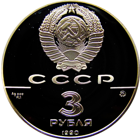 Сверху герб СССР с 15 витками ленты, под ним буквы «СССР», ниже слева и справа черта, под чертой слева химическое обозначение «Ag» и проба «900» металла из которого сделана монета, под ними чистый вес драгоценного металла «31,1», под чертой справа монограмма монетного двора «ММД», ниже обозначение достоинства монеты цифра «3» и ниже слово «РУБЛЯ», внизу у канта год выпуска монеты «1990».