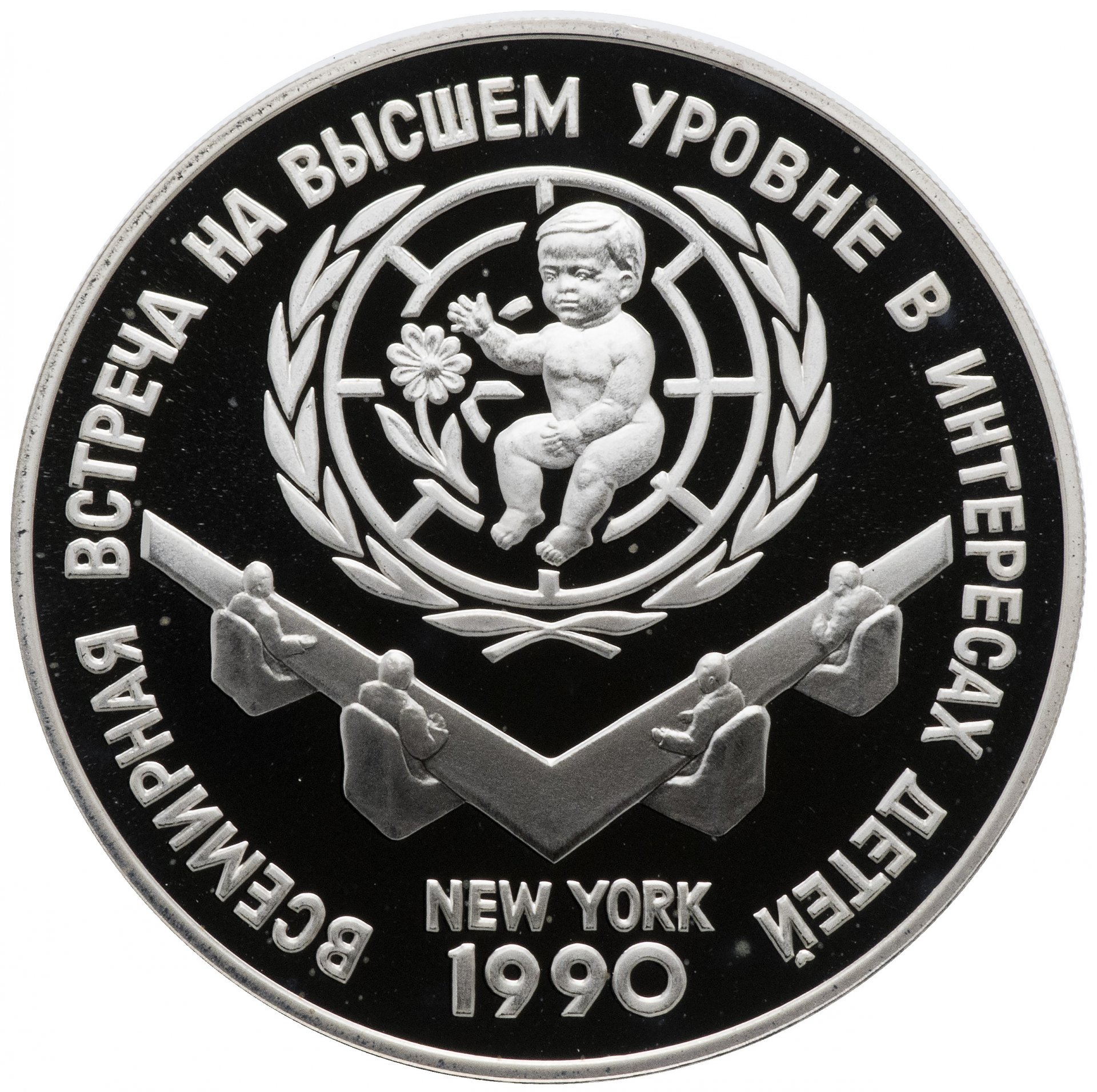 Слева, сверху и справа вдоль канта монеты слова «ВСЕМИРНАЯ ВСТРЕЧА НА ВЫСШЕМ УРОВНЕ В ИНТЕРЕСАХ ДЕТЕЙ», в середине эмблема Международной конференции в защиту детей, ниже изображено заседание конференции и слова «NEW YORK», под ними год проведения конференции «1990».