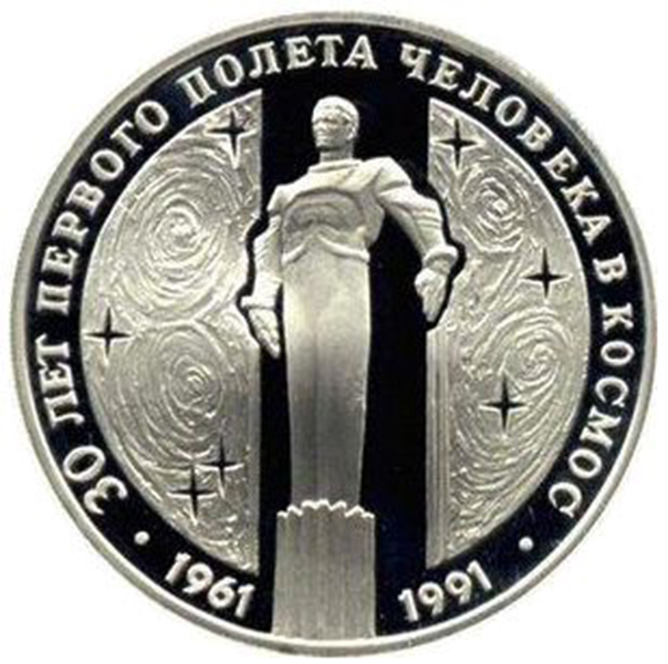 слева, сверху и справа вдоль канта монеты слова «30 лет первого полета человека в космос», в середине памятник первому человеку в космосе Ю.А. Гагарину, слева и справа - звездное небо, внизу вдоль канта слева от памятника год «1961», справа «1991».