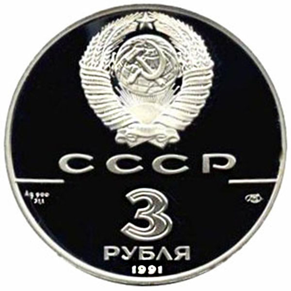 сверху герб СССР с 15 витками ленты, под ним буквы «СССР», ниже слева и справа черта, под чертой слева химическое обозначение «Ag» и проба «900» металла из которого сделана монета, под ними чистый вес драгоценного металла «31,1», под чертой справа монограмма монетного двора «ЛМД», ниже обозначение достоинства монеты цифра «3» и ниже слово «РУБЛЯ», внизу у канта год выпуска монеты «1991».