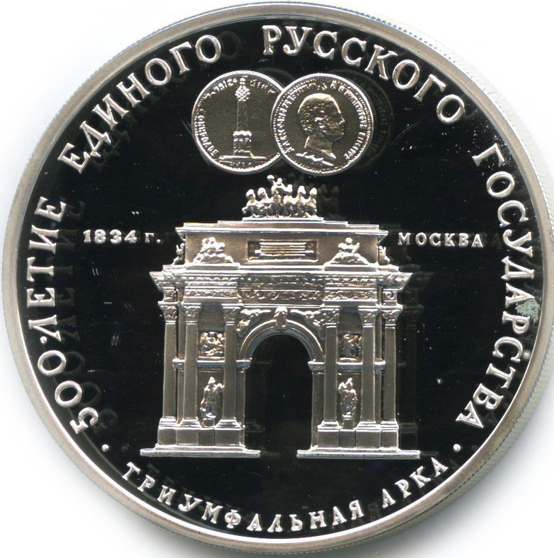 слева, сверху и справа вдоль канта монеты слова «500-ЛЕТИЕ ЕДИНОГО РУССКОГО ГОСУДАРСТВА», сверху аверс и реверс памятной монеты «Открытие памятника императору Александру I в Санкт-Петербурге» 1834 г., ниже Триумфальная арка, слева год «1834 г.», справа слово «Москва», внизу вдоль канта слова «ТРИУМФАЛЬНАЯ АРКА».
