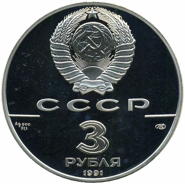 сверху герб СССР с 15 витками ленты, под ним буквы «СССР», ниже слева и справа черта, под чертой слева химическое обозначение «Ag» и проба «900» металла из которого сделана монета, под ними чистый вес драгоценного металла «31,1», под чертой справа монограмма монетного двора «ММД», ниже обозначение достоинства монеты цифра «3» и ниже слово «РУБЛЯ», внизу у канта год выпуска монеты «1991».