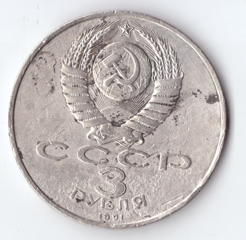3 рубля 1991 года 50 лет разгрома немецко-фашистских войск под Москвой (есть дефект поверхности) VF